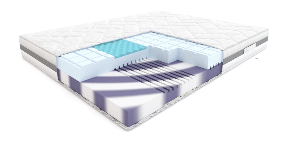 Wkład: po jednej stronie pianka wysokoelastyczna HR o wys. 11 cm z warstwą pianki FloFom w strefie ramion i barków, po drugiej stronie pianka wysokelastyczna VelvetTouch o wys. 11cm z warstwą pianki Visco w strefie ramion i barków.