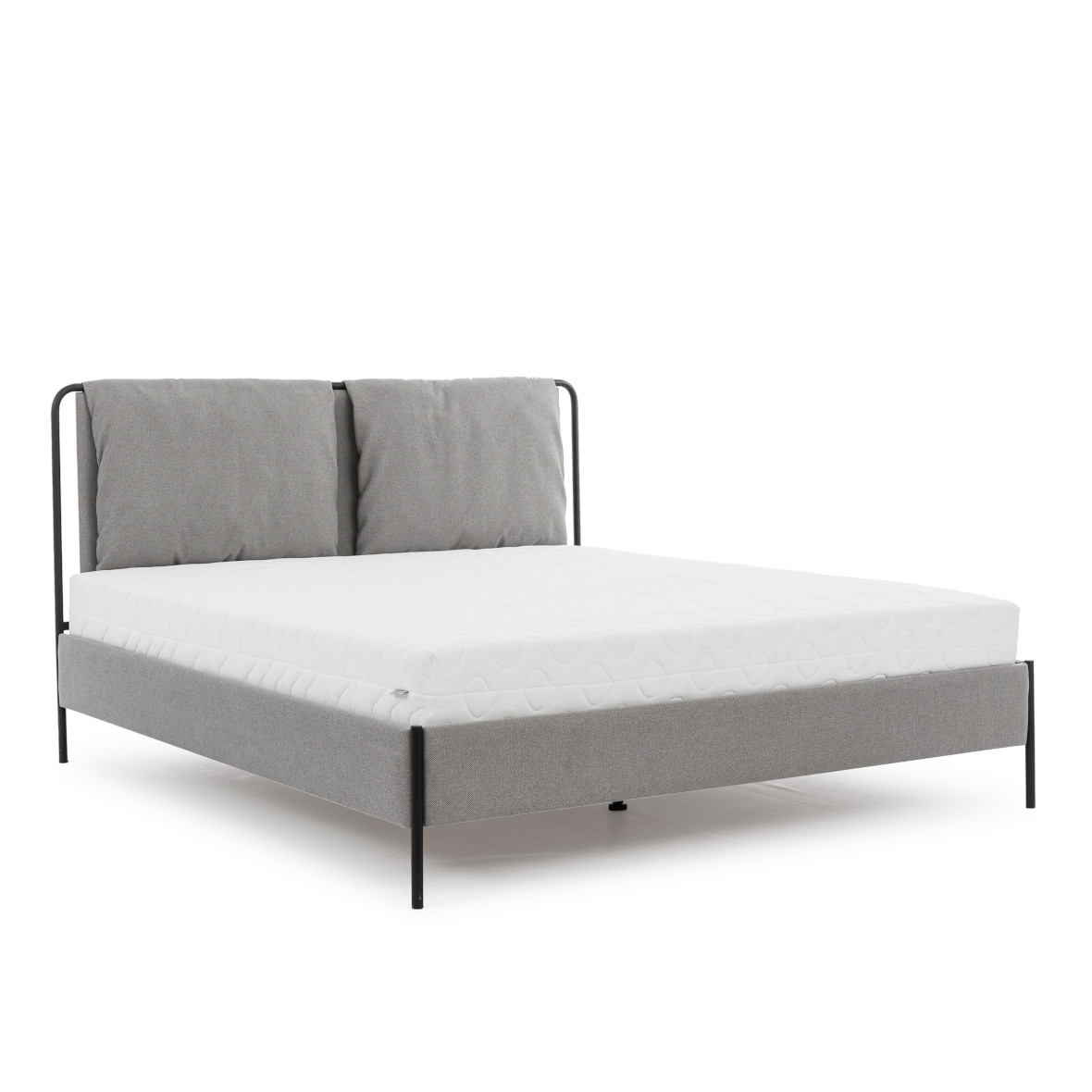 Niezwykle oryginalne, lekkie łóżko na konstrukcji z okrągłych, metalowych rurek. Wezgłowie sprawia wrażenie nonszalancko przewieszonych przez metalową konstrukcję, miękkich poduszek, w rzeczywistości za nimi znajdują się solidne, tapicerowane panele stanowiące bezpieczne podparcie. Czarne nóżki z okrągłych rurek, cofnięte w delikatną podstawę pięknie łączą boki i przód łóżka.