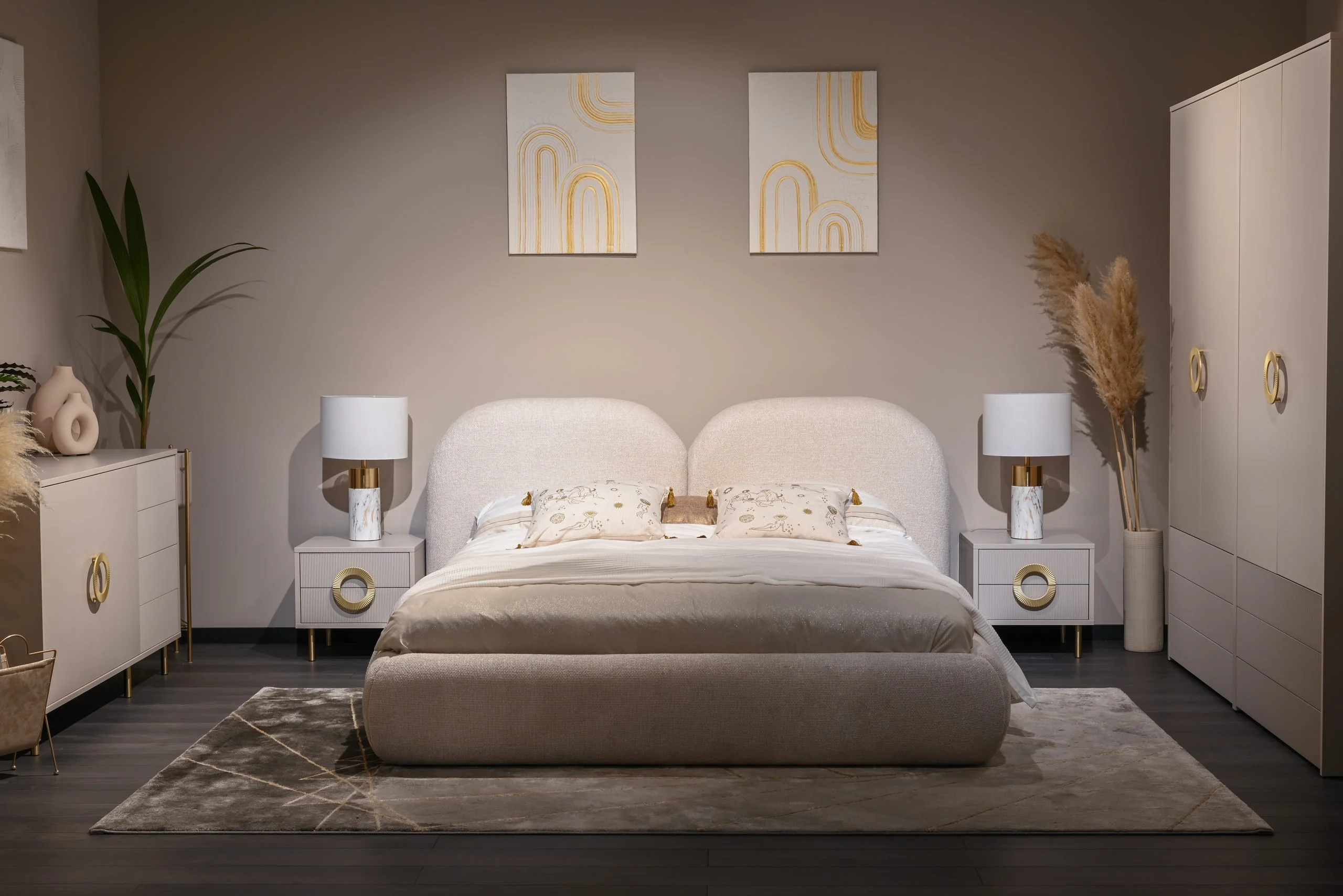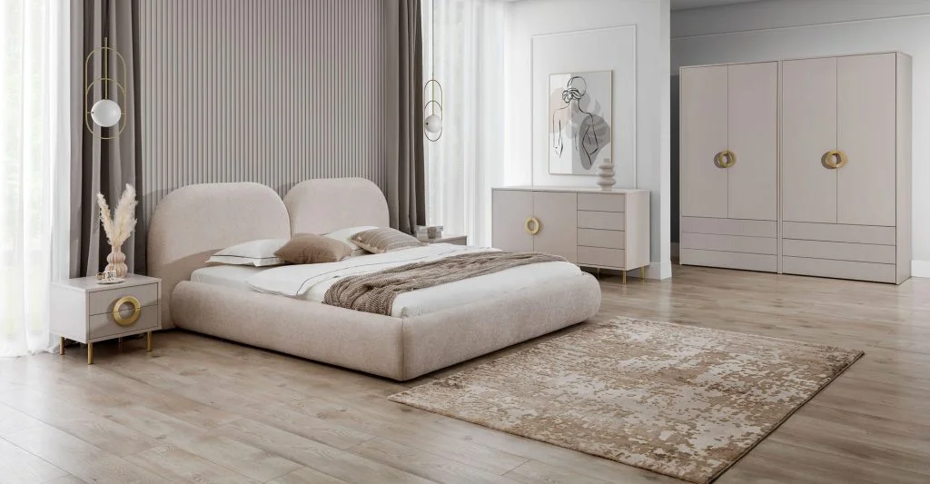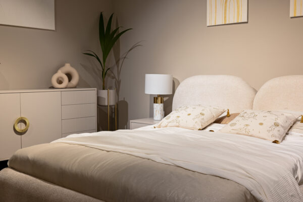 Piękne, designerskie łóżko z oryginalnym wezgłowiem o obłym kształcie dzielonym pośrodku. Miękka linia zaokrąglonej podstawy pięknie komponuje się z linią zagłówka.