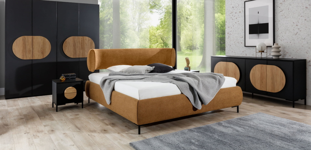 Nowoczesne łóżko z zaokrąglonym, designerskim wezgłowiem zakończonym owalnymi elementami z ozdobna lamówką. Oparcie łóżka regulowane w trzech wysokościach. Zdobywca Złotego Medalu MTP w 2023 roku.