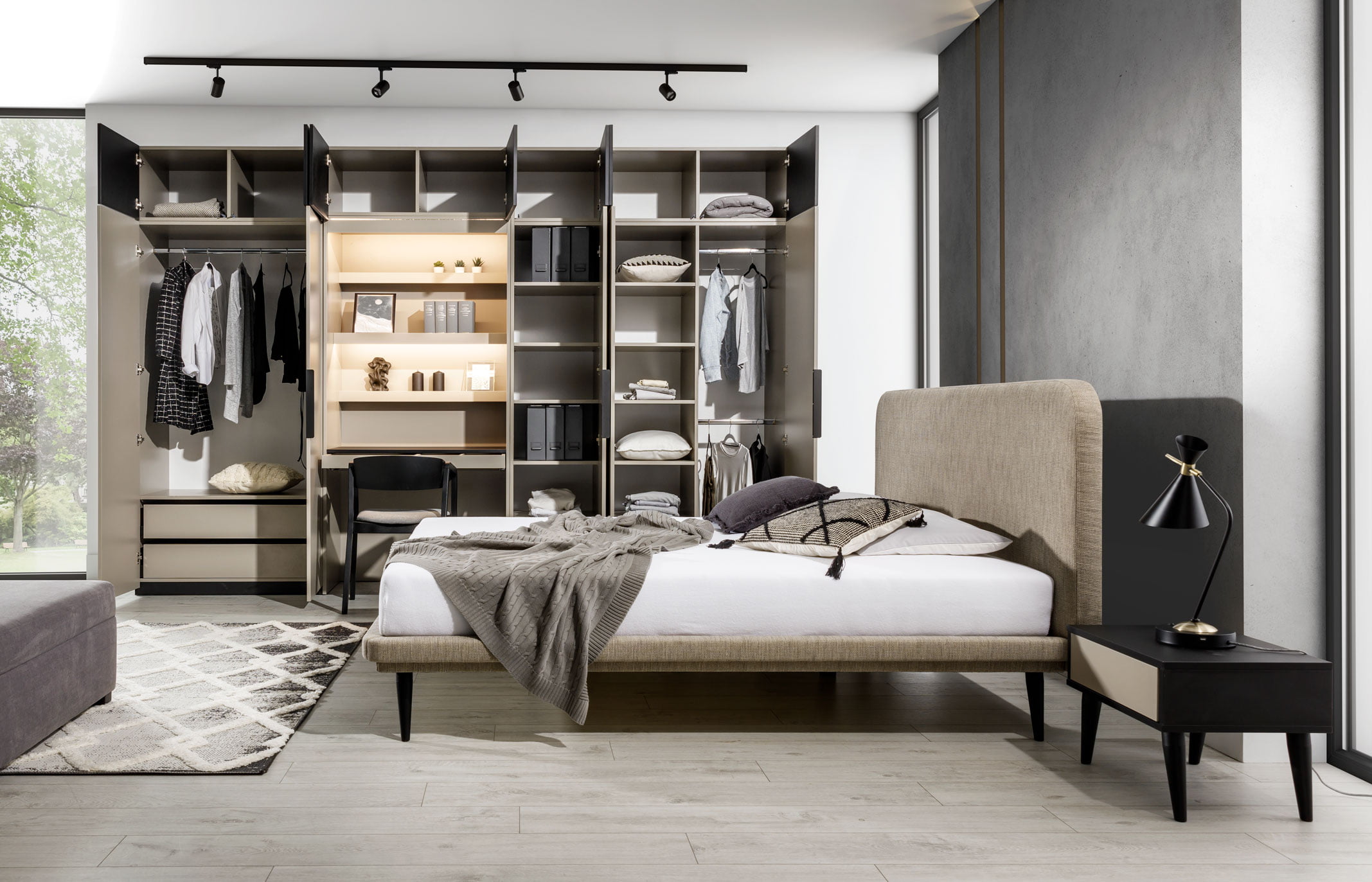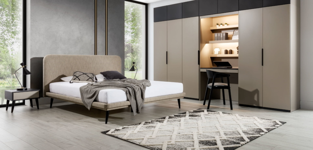 Nowoczesne, lekkie łóżko z delikatnie zaokrąglonym na bokach zagłówkiem. Geometryczna podstawa wsparta na wysokich, czarnych nóżkach, wyposażona w zintegrowany stelaż lamelowy.
