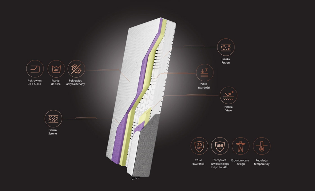 Pianka FusionPianka hybrydowa, łącząca najlepsze cechy pianek konwencjonalnych i wysokoelastycznych. Najnowsza w swojej klasie. Stworzona z wysokiej jakości materiałów jest bardzo wytrzymała i nie traci swojej struktury w warunkach podwyższonej wilgotności. Dzięki wysokiemu poziomowi elastyczności, daje duże poczucie komfortu. Konturowe nacięcia pozwalają na podzielenie pianki na 7 stref twardości. Kształt i głębokość nacięć wpływają na twardość materaca w poszczególnych modelach.