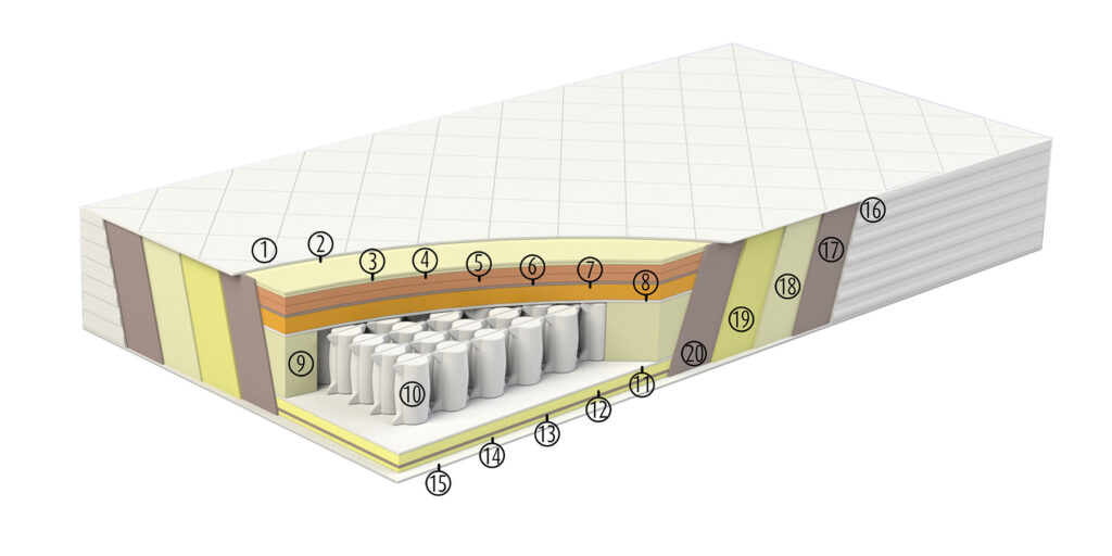 Sprężyny diamentowe 5 strefowe kieszeniowe– o zróżnicowanej twardości, odpowiadają za właściwe podparcie kręgosłupa na całej powierzchni materaca. Indywidualna praca sprężyn pozwala na zredukowanie przenoszenia drgań na partnerów. We wkładzie wykorzystano diamentowe sprężyny, wpływające na jeszcze lepszą elastyczność i bardziej precyzyjne podparcie całego ciała.